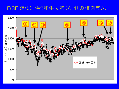 BSE確認に伴う枝肉市況については、3例目(群馬県産)確認直後に最安値が記録されましたが、その後の確認に伴う大きな変動はみられていません。