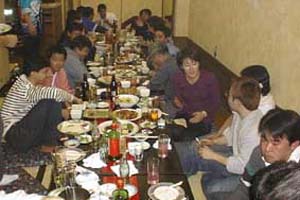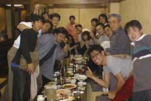 手締め 時計はすでに午前0時を廻っています。 この飲み会のために翌日有給休暇をとっている者もいます。 2次会は「先生の家」、というのがメンバーの永遠の夢。です。 いつかは許して下さい!先生(の奥さん)!! | ![]() |